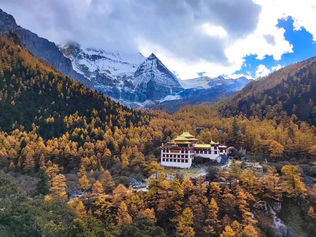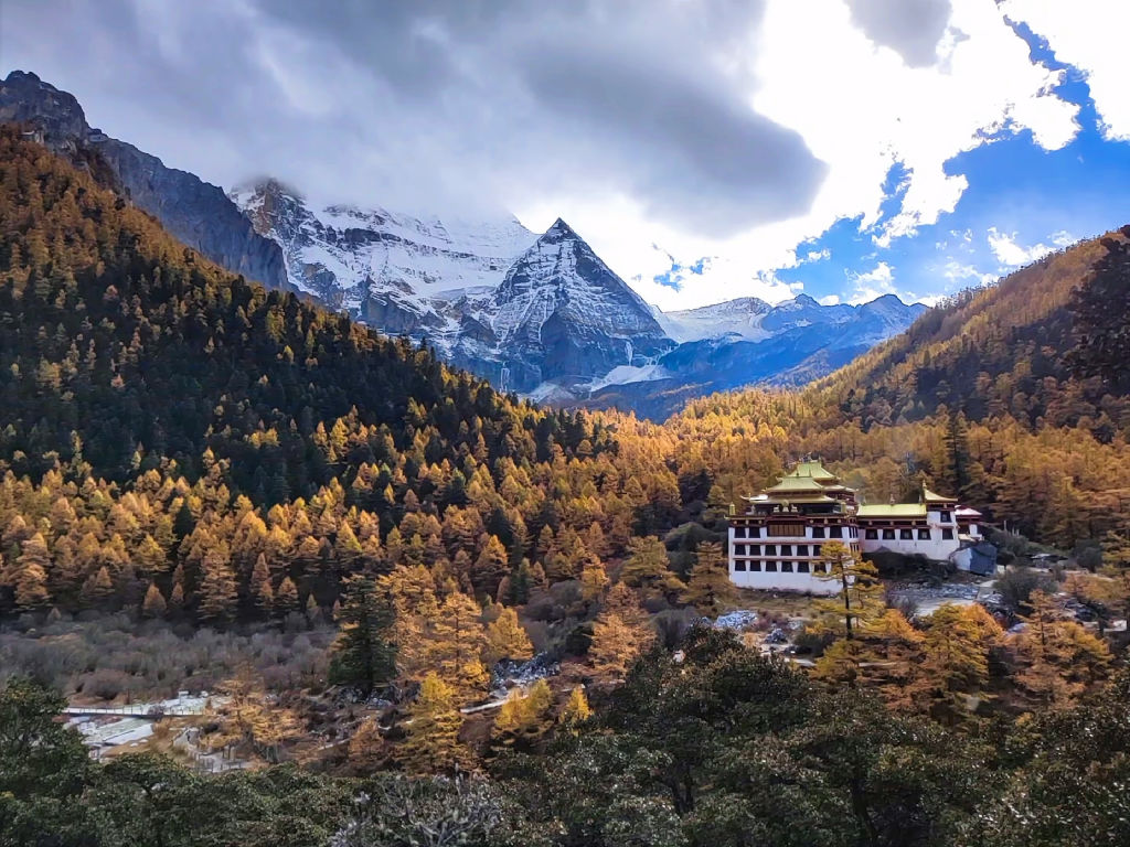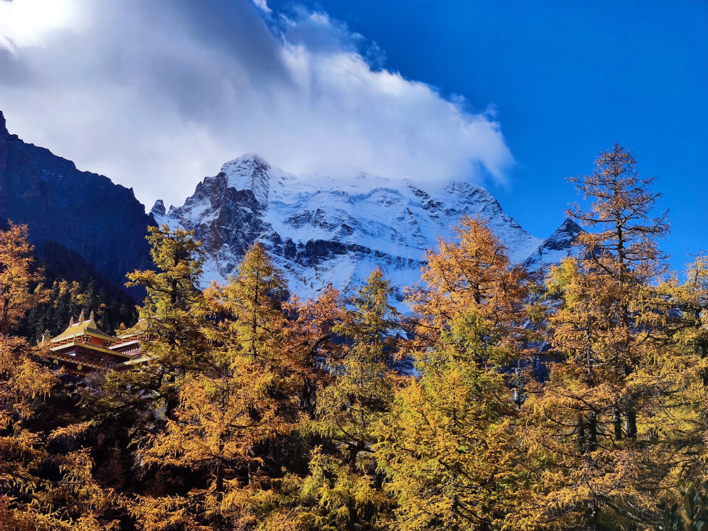 Magnifique contraste entre les toits du monastère et les glaciers du Xiannairi