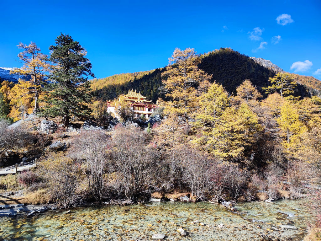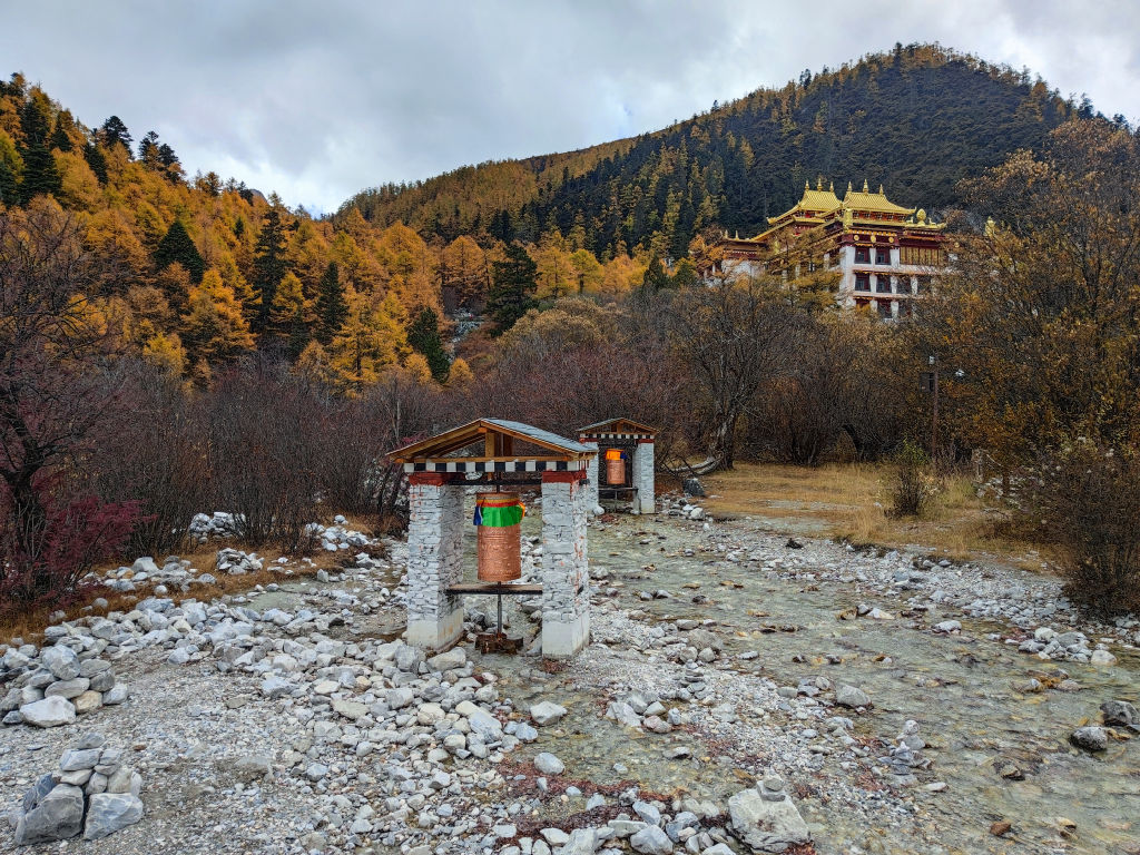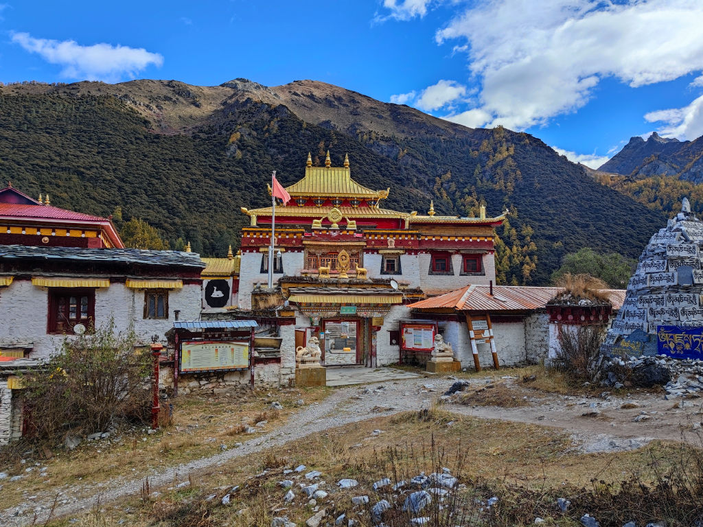 Ce monastère a une longue histoire, sa position au pied de la plus haute montagne de Yading et à proximité du lac de Zhenzhu Hai, mais son aspect actuel opulent est récent. En tout cas son style s’intègre parfaitement dans son cadre naturel, on se sent complétement hors du temps ici.