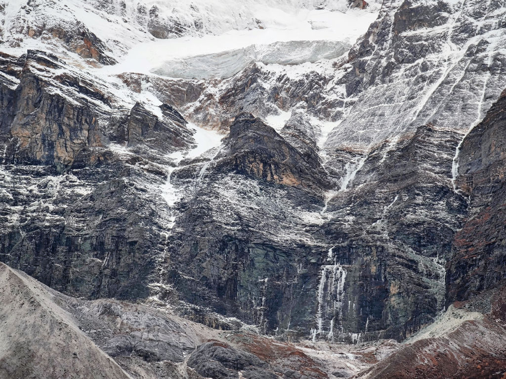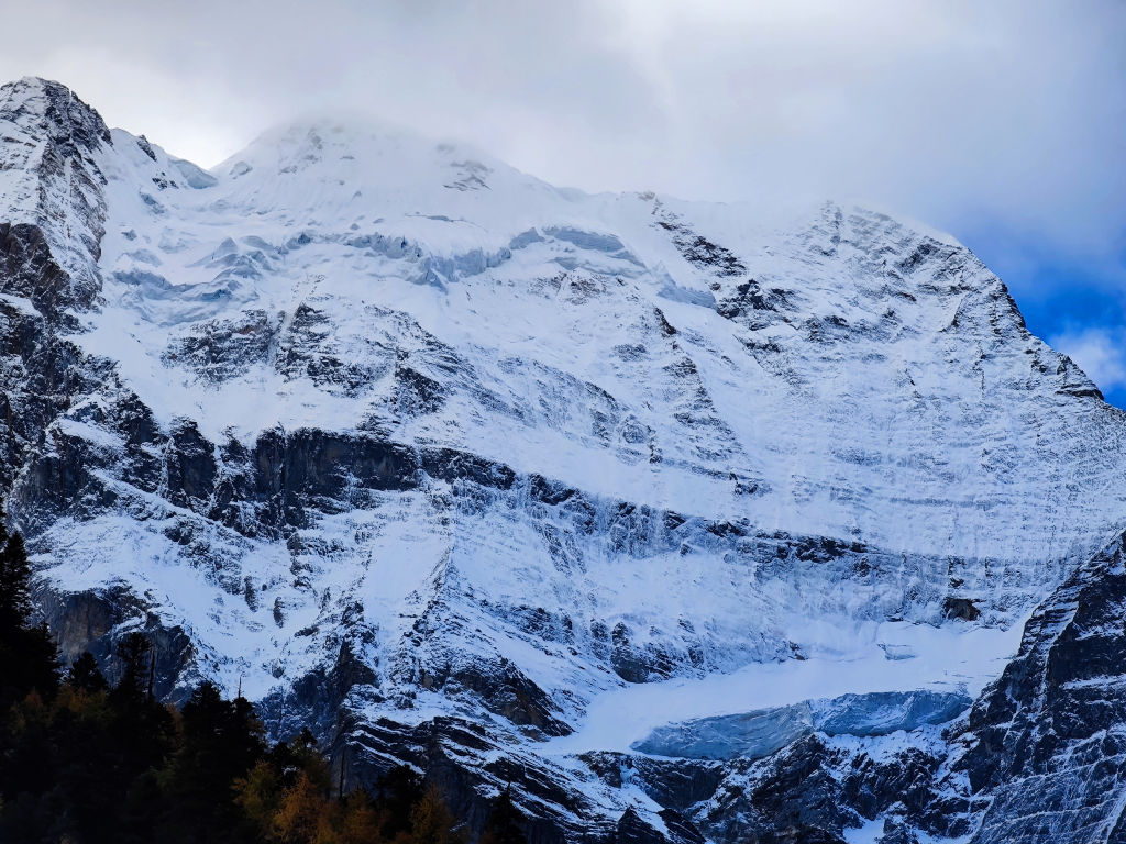 Finalement le ciel se dégage partiellement, le sommet du Xianuoduoji au fond de la vallée glaciaire est grandiose avec ce temps terrible.
