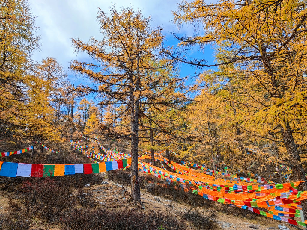 Ce matin le chauffeur du bus nous fait le plaisir de nous arrêter à un autre point de vue qui nous permet d’apprécier la vue sur le village de Yading et les sommets enneigés qui émergent au-dessus de la forêt aux couleurs dorées.