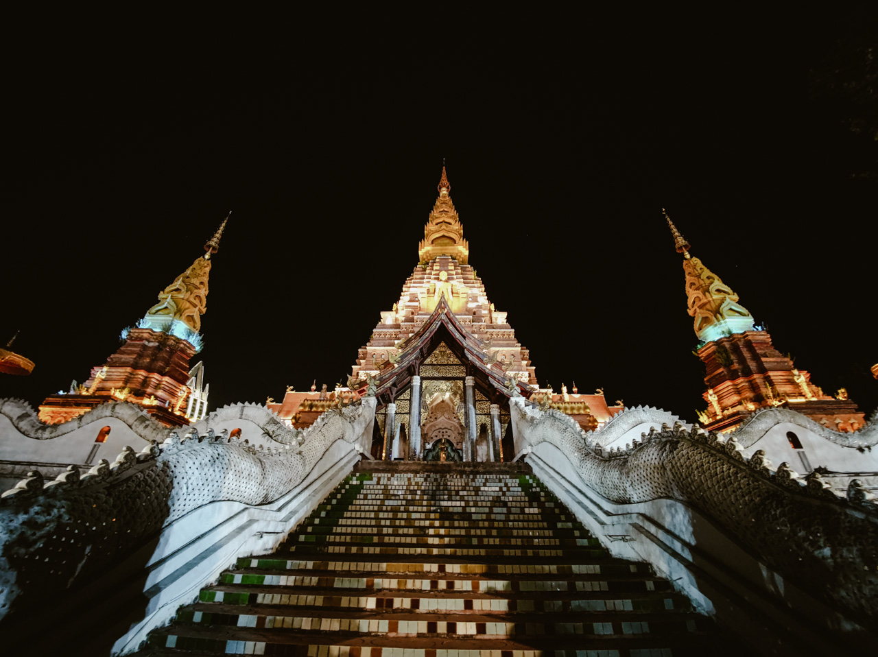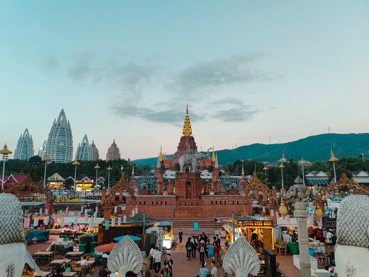 Le grand stupa de Jinghong est le nouveau centre touristique de la ville, cet immense édifice religieux est devenu le symbole de la ville. Le marché de nuit qui est organisé tous les soirs entre la stupa et le Mékong est clairement une des meilleures expériences de marché de nuit de toute la Chine, il est très grand l’ambiance est bouillante.