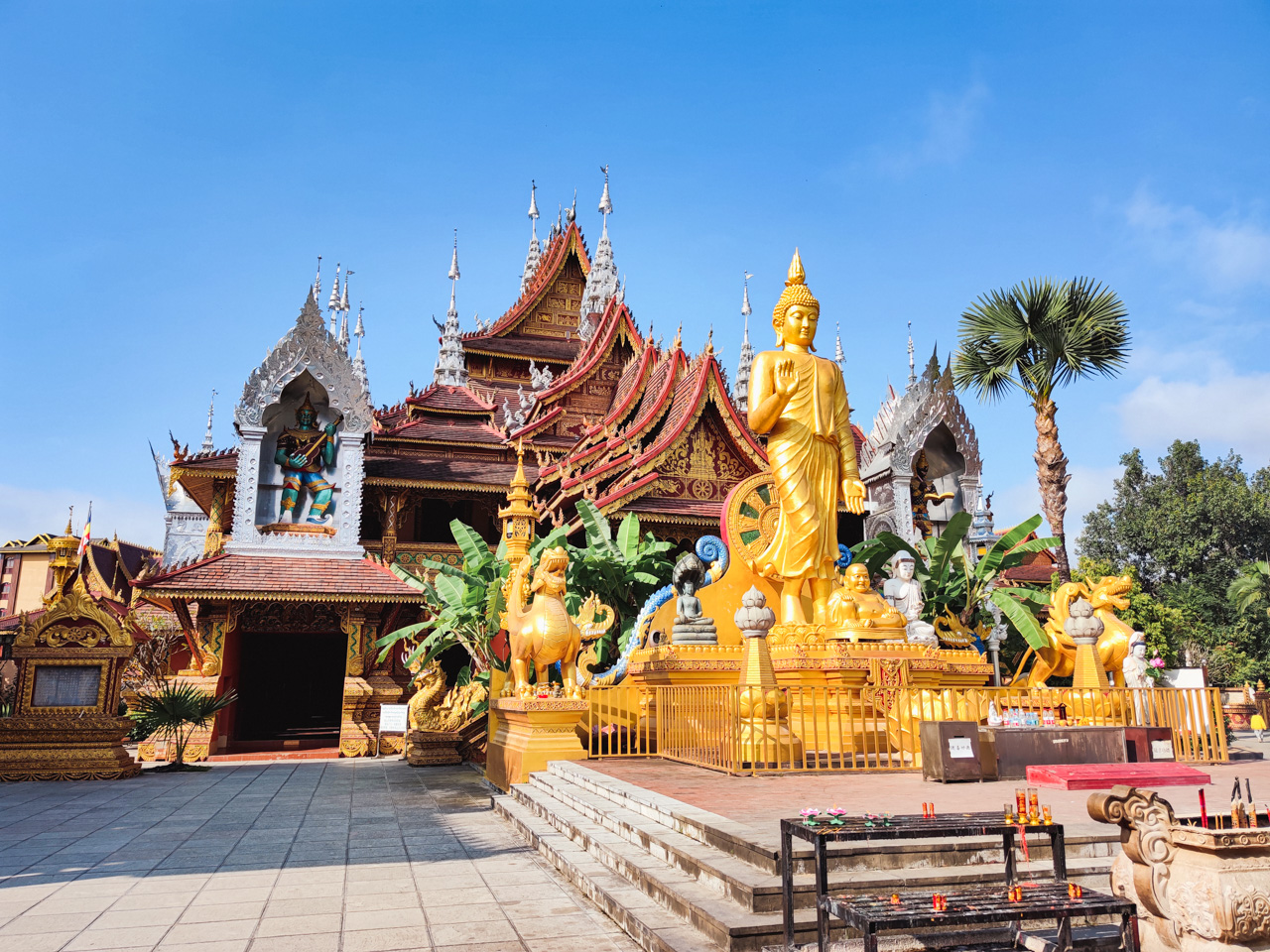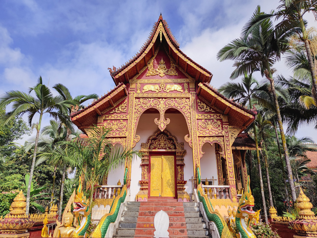Aujourd’hui il faut rentrer à Hangzhou, mais avant je visite le dernier grand temple de JH que je n’avais pas encore visité, car on l’avait raté lors de notre promenade dans le parc de Manting. Les deux sites étant collés l’un à l’autre. Cette fois je trouve l’entrée par la porte Sud. Le temple est grandiose dans le style de Xishuangbanna. C’est un véritable lieu de culte et il faut prendre le temps de visiter les différents bâtiments et le parc.