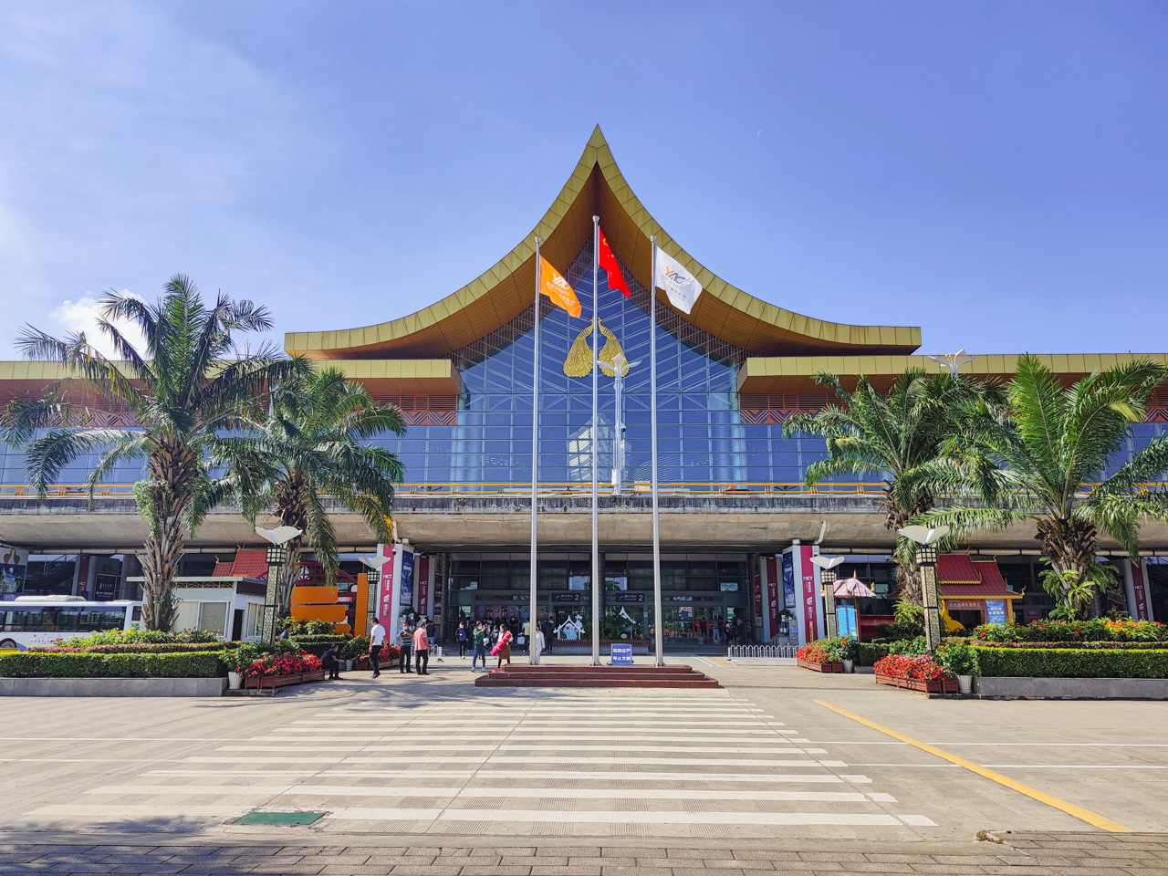 Je récupère mes bagages à l’hôtel pour rejoindre l’aéroport. Sur la route je passe devant la nouvelle gare de Jinghong, qui fait étape entre Kunming et Vientiane sur une des premières lignes à grande vitesse transnationale construite par la Chine. On est dans les derniers préparatifs ; la ligne ouvre dans moins d’une semaine. Les abords de la route sont fleuris et des décorations d’éléphants sont installées aux carrefours provoquants des embouteillages.