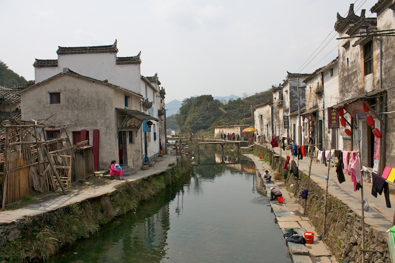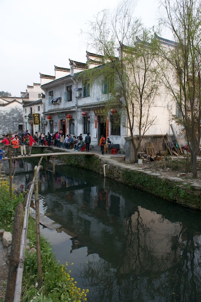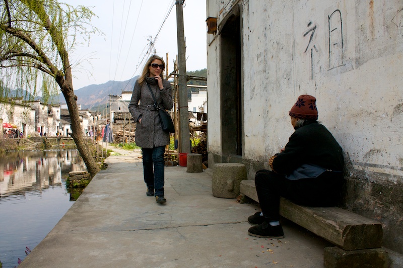 Le petit village de Likeng se trouve au confins d'une route de montagne difficile. Impossible n'est pas chinois, alors que l'on ne pouvait pas croiser une voiture berline avec notre van, on voit un bus garé sur le parking devant le village. Le village s'est construit le long d'une petite rivière. Les maisons sont de l'époque Tang et/ou modernes, l'atmosphere de ce lieu est intéressante : de nombreux étudiants en dessins sont assis le long de la rivière et le regard sérieux peignent le paysage avec plus ou moins de réussite, on verra un véritable artiste à l'oeuvre. En visitant une ancienne école populaire (traduction de l'inscription en chinois sur la porte) avec une ancienne peinture murale propagandiste. Myriam sera à ce moment là interceptée par des photographes chinois qui la prennent en photo pendant un quart d'heure. De 3 au début, ils seront finalement une vingtaine à la prendre en photo.