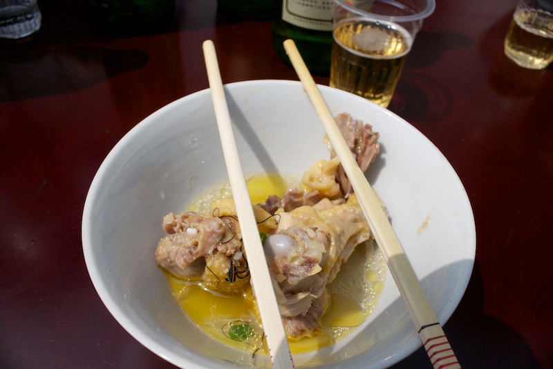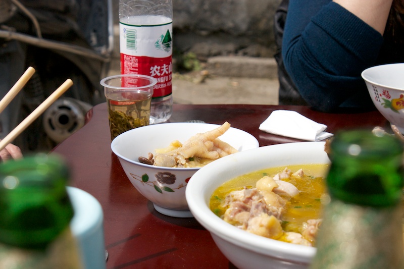 Pour le repas, notre chauffeur nous propose de s'occuper du choix du restaurant. Merveilleuse idée, il a aussi des talents de cuisinier caché et surtout c'est un critique gastronomique hors pair. Je m'amuse à le suivre dans sa quête du restaurant du village où le plat principal consiste à tuer un poulet, le déplumer dans la rivière juste à côté de la grand mère qui lave son linge et d'une autre qui fait sa vaisselle, de le faire bouillir puis de le déguster dans son bouillon. L'obsession du chauffeur : trouver un paysan qui a des poulets fermiers qu'il a élevé lui-même. On est donc parti pour une visite de TOUTES les basse-cours du village afin d'analyser les poulets et l'écouter argumenter sur les qualité de tel ou tel volatile. On finit par en trouver un, et il décide de rester à côté du paysan pour vérifier qu'il tue bien le poulet qu'il avait choisi (80RMB pour le poulet entier). On s'installe dehors et on attend les plats avec quelques bières. Le poulet bouilli, c'est comme dire... bizarre. Mais ca se mange bien quand même.