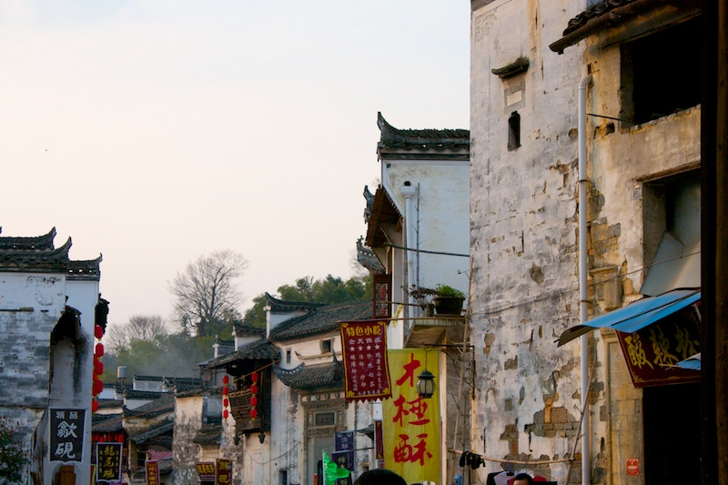Dans la vallée, tous les bus de touristes, les vans et voitures sont embouteillés. On ne peut pas circuler, nous décidons alors de changer d'étape et de visiter le village de Likeng (un autre Likeng) qui se trouve être une manne à touriste incroyablement abimée. Le droit d'entrée de 60RMB comme dans l'autre Likeng est injustifié lorsque l'on voit les infrastructures construites telles un parc d'attraction : des faux temples, une fausse rivière pour faire du canot à bambou (après avoir attendu une demi heure son tour), une rue commercante faite d'étals ressemblant aux marchés de Noël !!! On arrive finalement au village après que les filles aient succombé au désir d'achat, normal il y avait quand même des trucs intéressants disent elles. Le village est surement très beau, mais difficile d'aprécier quand on a l'impression que la totalité des 1,3 milliards de chinois ont décidé de se donner rendez-vous dans la rue centrale ! On se croirait à Zhouzhuang à côté de Shanghai un week-end de fêtes ou la gare de Canton un jour comme un autre. Pourtant dès que l'on sort de cette petite rue centrale, le village est VIDE ! on peut profiter des petites ruelles, des champs de colza alentours, de la nature à la nuit tombée seuls. Heureusement, car on était vraiment déçu avant cela. Pour rentrer au van, nous repassons dans la rue centrale encore plus densément peuplée, tout comme le chemin pour rentrer au parking, incroyable le nombre de touristes chinois que les bus déversent devant les portes de Likeng.