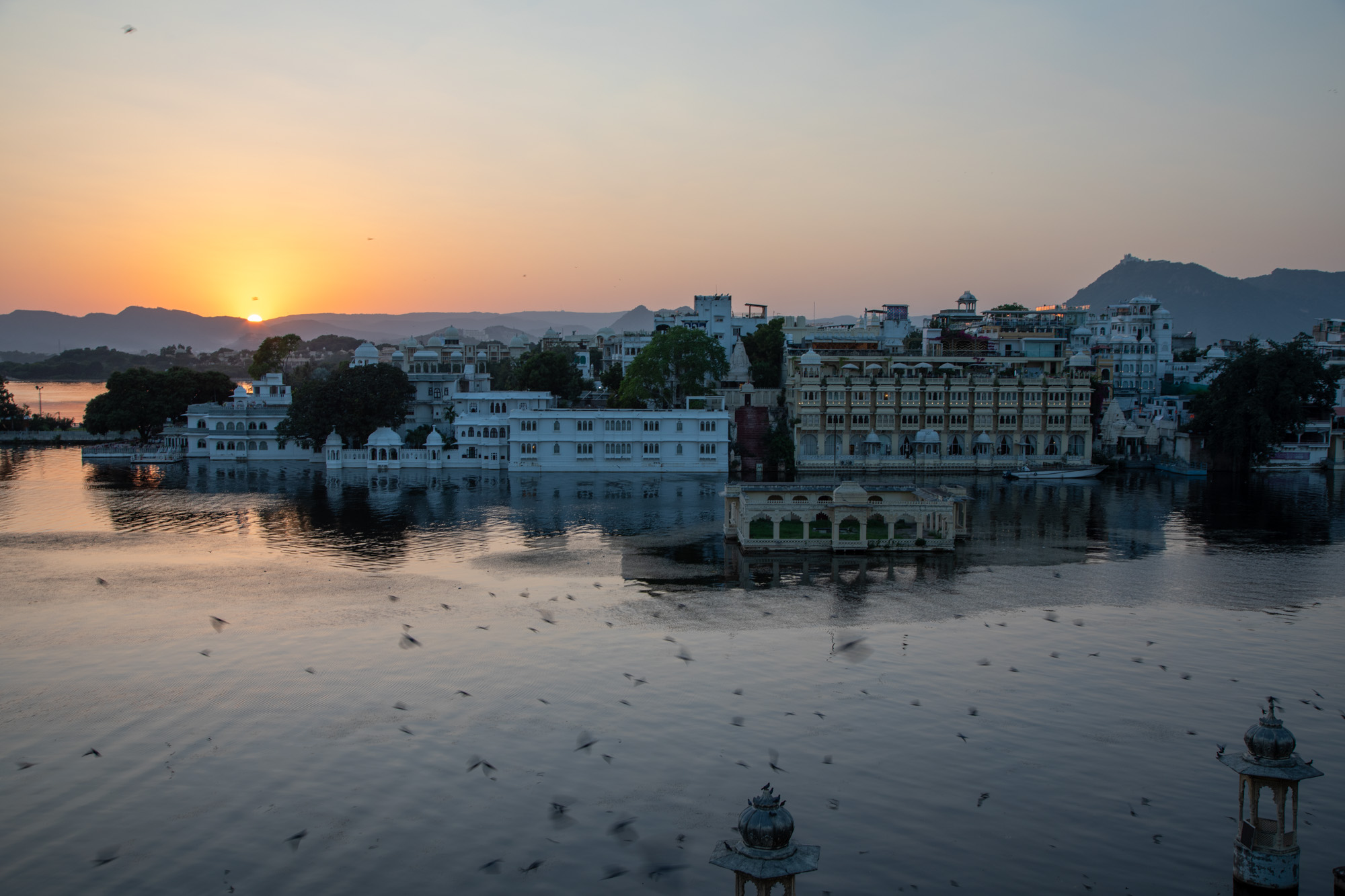 Après la visite du palais, on descend vers le lac et on monte dans un bateau pour faire une balade au coucher du soleil pour avoir une belle lumière chaude. A cette heure-ci, Udaipur révèle un visage tellement romantique.